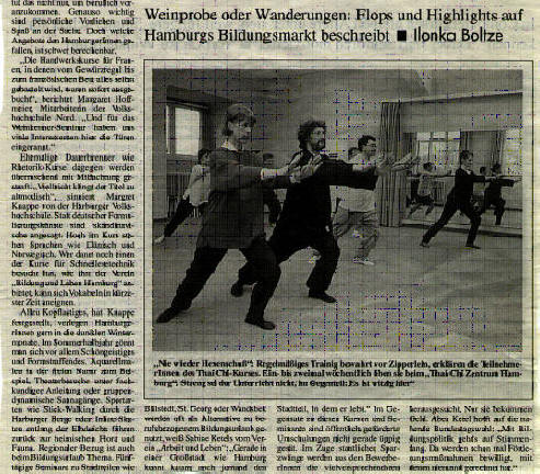 Viele meiner ersten Schüler aus Othmarschen wie Eva blieben lange Jahre dabei. Aus dieser Zeit gibt es viele Veröffentlichungen in den Zeitungen. Die Taijiquan-Szene/ Qigong-Szene hat sich seitdem jedoch sehr gewandelt - viele Angebote sind auf sehr niedrigem Niveau. Vorsicht: Es wird auch geworben mit Qualitätssiegeln des Dt. Taichi-Bundes, ohne dass dies der Wahrheit entspricht!