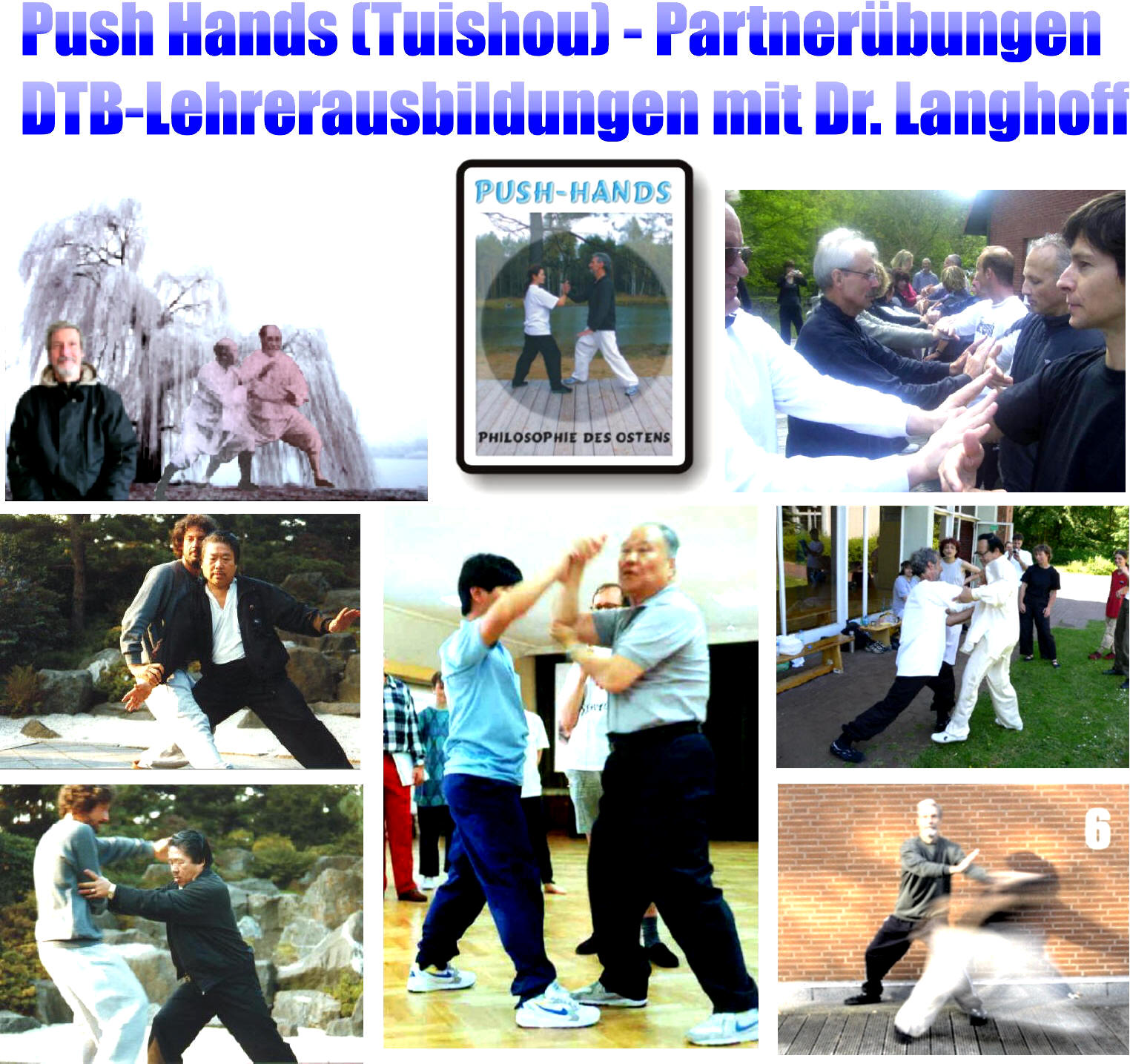 Die Tuishou-Partner-Sets bilden eine traditionell überlieferte Ergänzung zum Praktikum der Taiji-Solo-Formen. Sie entwickeln innerer Kraft, die für den beruflichen und privaten Alltag von großem Vorteil ist. Push-Hands mit seinem Einsatz von Fajin-Explosivkraft ist die thematische Klammer für Taijiquan und Qigong. Die chinesischen Tai-Chii-Qigong-Lehrmeister von Geschäftsführer Dr. Langhoff und ihre weltweite Reputation als Push-Hands-Meister bilden den Gegenstand lebhafter Diskussionen mit dem renommierten DTB-Ausbilder. Das hat seinen Grund zum einen darin, daß er über seine persönlichen Beziehungen zu chinesischen Tuishou-Meistern recht offen berichtet und zum anderen in seiner wisssenschaftlichen Prägung, in der für die traditionelle Esoterik-Folklore kein Platz ist. Dies kommt bei vielen Menschen offenbar weit besser an als die gängigen naiv-geschönten "Hofberichtserstattungen" der Szene. Zudem gilt: "Push-Hands-Meister" bzw. "Tuishou-Meister" ist keine klar definierte abgrenzbare Graduierung - die "Meisterschaft" liegt ganz klar im Auge des Betrachters. Quelle: Push-Hands-Meister /Tuishou-Meister.