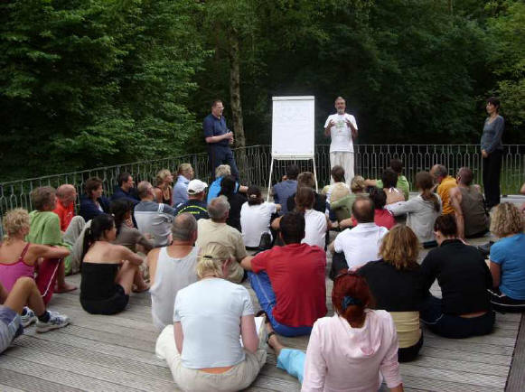 Workshop auf der Terrasse mit Flipchart und Diskussionen über das "Schattenboxen Innere Kampfkunst".